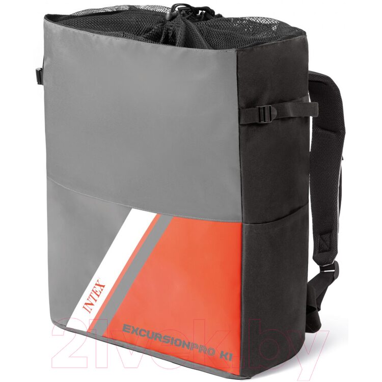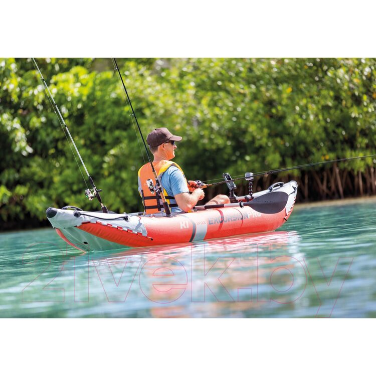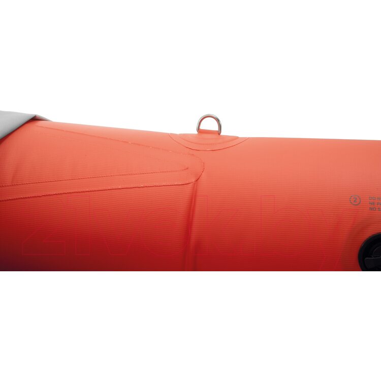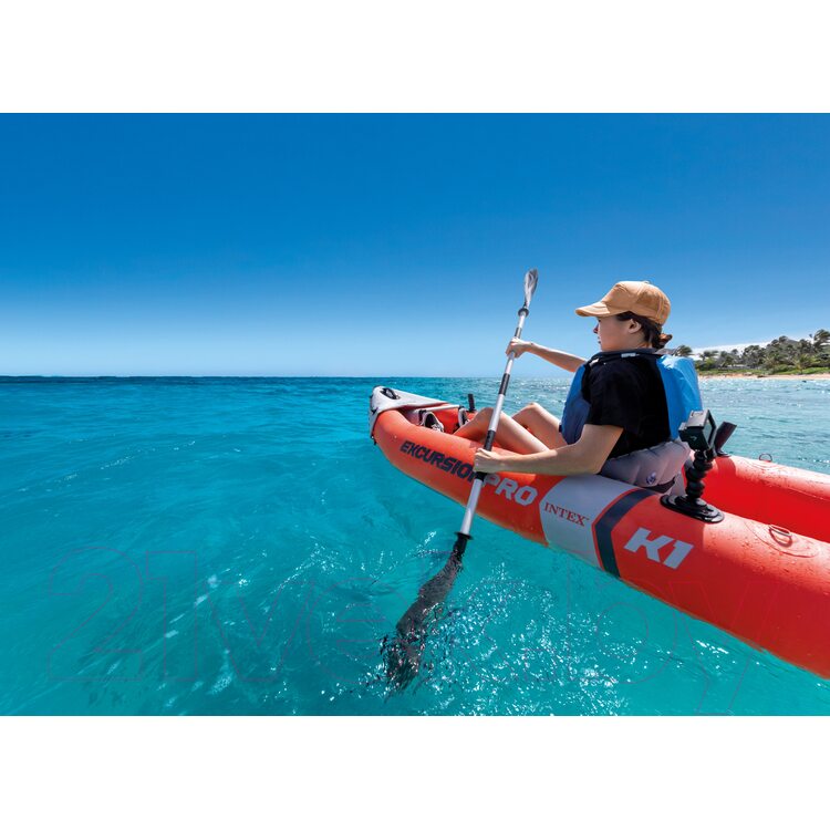 Каяк выполнен в ярком и заметном цвете, что подходит всем международным требованиям безопасности. А обтекаемая форма снижает возникновение лишней нагрузки во время гребли. Надувное сиденье оснащено регулируемой спинкой, что позволит устроиться более комфортно. Ручки у модели располагаются спереди и сзади, что облегчает швартовку и транспортировку байдарки. Управлять моделью можно на любой глубине — это позволяют сделать 2 съемных скега. С двух сторон расположены страховочные тросы, что очень удобно. Для того, чтобы делать правильный упор во время быстрой гребли у байдарки имеются подножки.