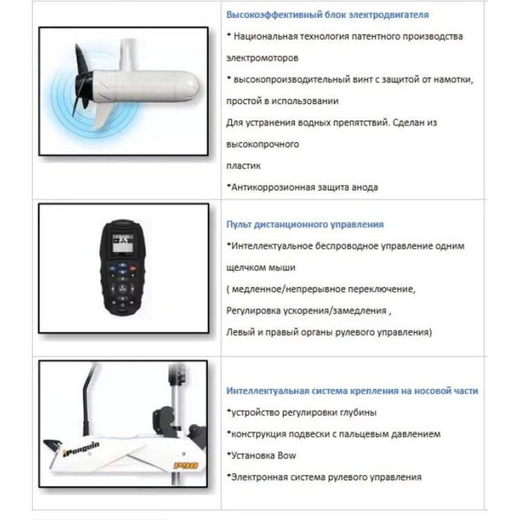 - iPenguin P90 — это высокотехнологичный электромотор, который гарантирует надёжную и стабильную работу даже в сложных погодных условиях, обеспечивает комфортное управление с функцией автоматической навигации и автопилота, а также поддерживает постоянную скорость движения благодаря круиз-контролю, делая каждое плавание максимально эффективным и безопасным.
